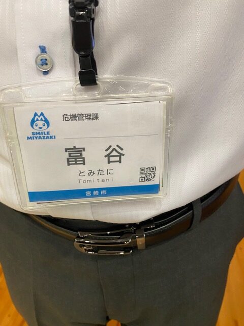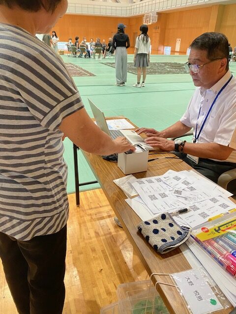 先日、9月28日(日)神宮西地区自治会主催の避難訓練に参加してきました。南九州大学アリーナでの開催となりました。宮崎市の職員や大学のボランティア、地区の役員が中心になって運営が行なわれました。災害が発生してから、一時避難所に集合し、点呼後に大学の方へ移動されました。住民の皆様には名前とQRコードが配布されており、持参されて機械で読み取って個人の特定や人数把握に使用されておりました。