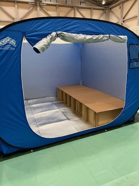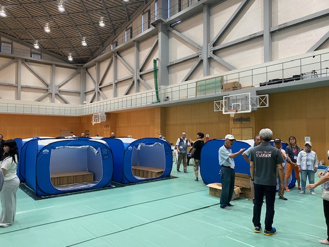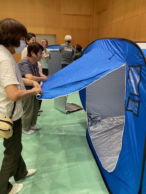 集合してから各班に分かれて簡易テントとベッド作りを協力して行いました。皆さん汗をかきながら一生懸命作っておられました。テントはあっという間に出来上がり!プライバシーを守るための大切なアイテムですね。本当にありがたいです。